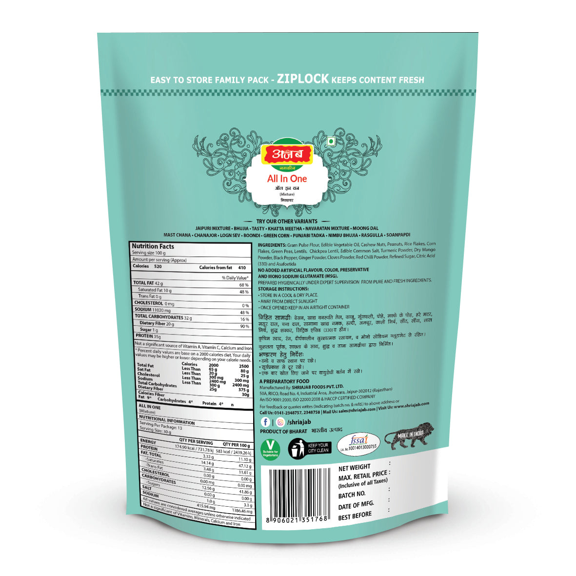 Bring home the joy of variety with Shri Ajab Foods’ All In One Mixture, a delicious blend of crunchy sev, spiced peanuts, roasted dal, crispy flakes, and aromatic masalas. Each bite offers a perfect balance of sweet, spicy, and tangy flavors, making it the ultimate anytime snack.
