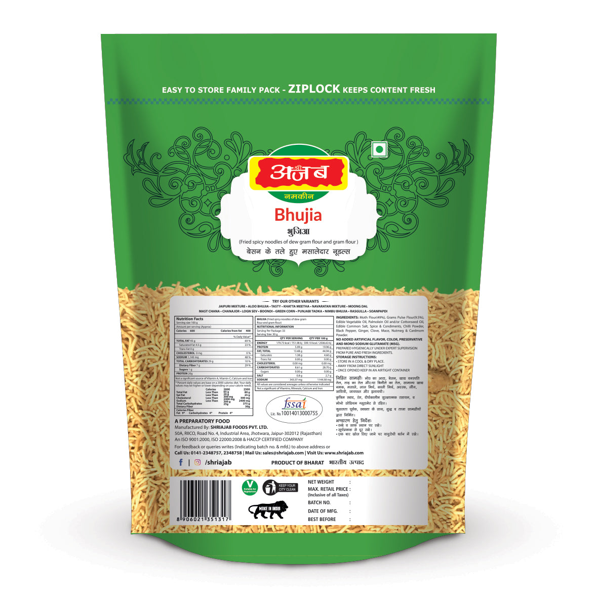 Experience the timeless taste of Shri Ajab Foods’ Bhujia, made from a traditional blend of dew gram flour and gram flour, fried to crispy perfection and seasoned with bold, aromatic spices. Each bite delivers a sharp crunch and a spicy burst that true namkeen lovers can’t resist.